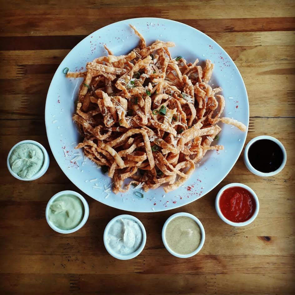 Uma porção generosa de tirinhas de massa de pastel, fresquinha e crocante, acompanhada de seis molhos exclusivos.