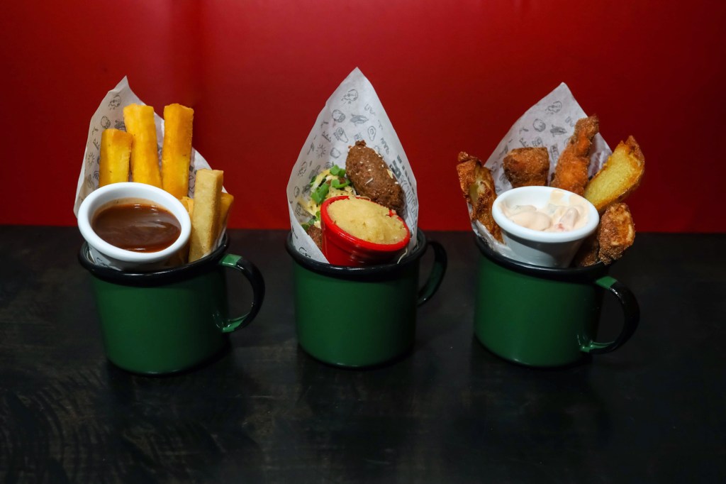 Tradicionais petiscos de bar estão na lista do pub. A Mandioca (R$ 9,90) conta com 150 gramas de mandioca palito frita salpicada com queijo parmesão e acompanhada de cheddar. O Quibe (R$ 17,90) é apresentado em porção de oito unidades recheadas com queijo e acompanhadas de pasta de grão de bico, enquanto as Fritas (R$ 9,90) têm 150 gramas de batatas palito servidas com cheddar.