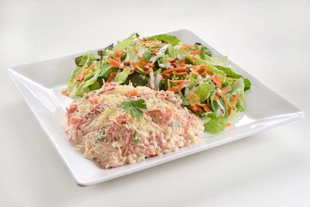Há também três tipos de grelhados que combinam com os risotos. O Frango é servido grelhado assim como o Salmão. A Polpeta é recheada com queijo mussarela e coberta com molho ao sugo.