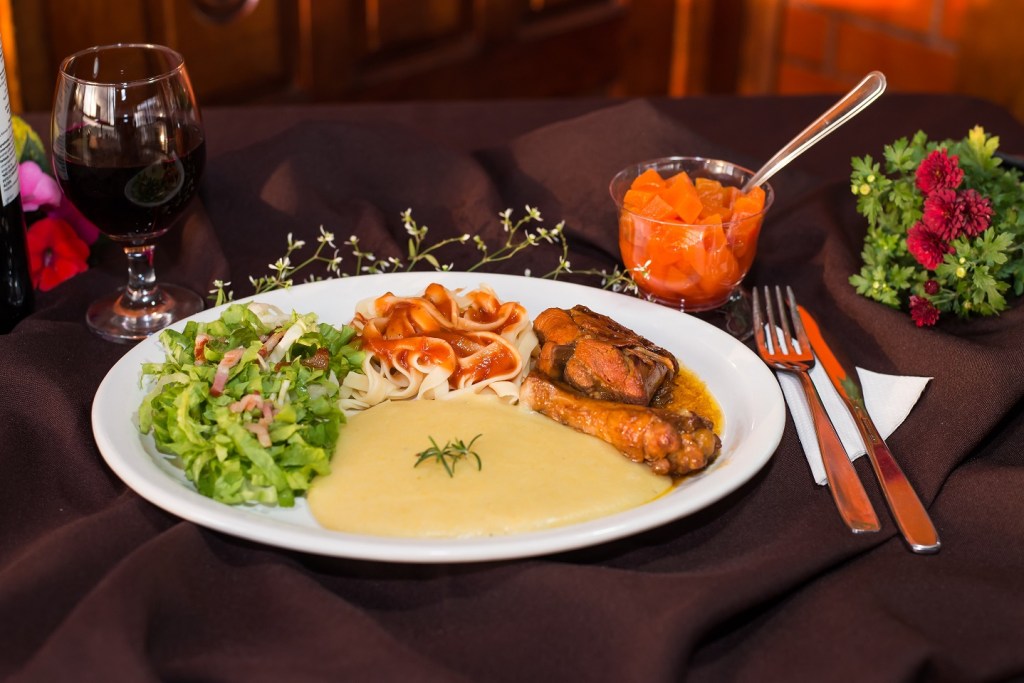 Pastacciuta – Frango Caipira com Polenta (frango caipira de criação orgânica com polenta cremosa, talharim ao sugo, salada de escarola com bacon, doce de abóbora como sobremesa e mais uma taça de vinho)