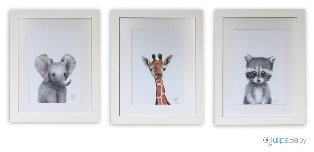 A técnica apurada em pintura a lápis de cor e grafite, com traços realistas, ganham destaque na nova coleção de quadros decorativos da TulipaBaby.