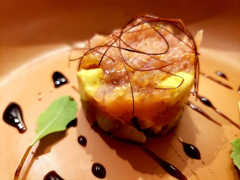 Tartar de atum com foie gras com pequenos fios de pimenta especial.