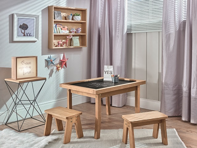 Composta por base de mesa, tampo com quadro negro (que pode ser usado como tampo da mesa ou pendurado na parede) e banquinhos, a Linha Multifuncional é desenvolvida em madeira maciça reflorestada com acabamento atóxico na cor avelã, e é perfeita para realizar atividades que estimulam o crescimento dos pequenos, como pintar, encaixar, desenhar, brincar de massinha e fazer os deveres da escola.