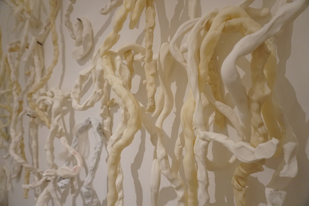 O curador Adolfo Montejo Navas explica que há uma intervenção clara da obra no espaço da sala expositiva. “Uma única escultura contemporânea feita a partir de resina plástica parece brotar da parede e invadir boa parte do espaço, causando uma sensação surrealista”, informa.