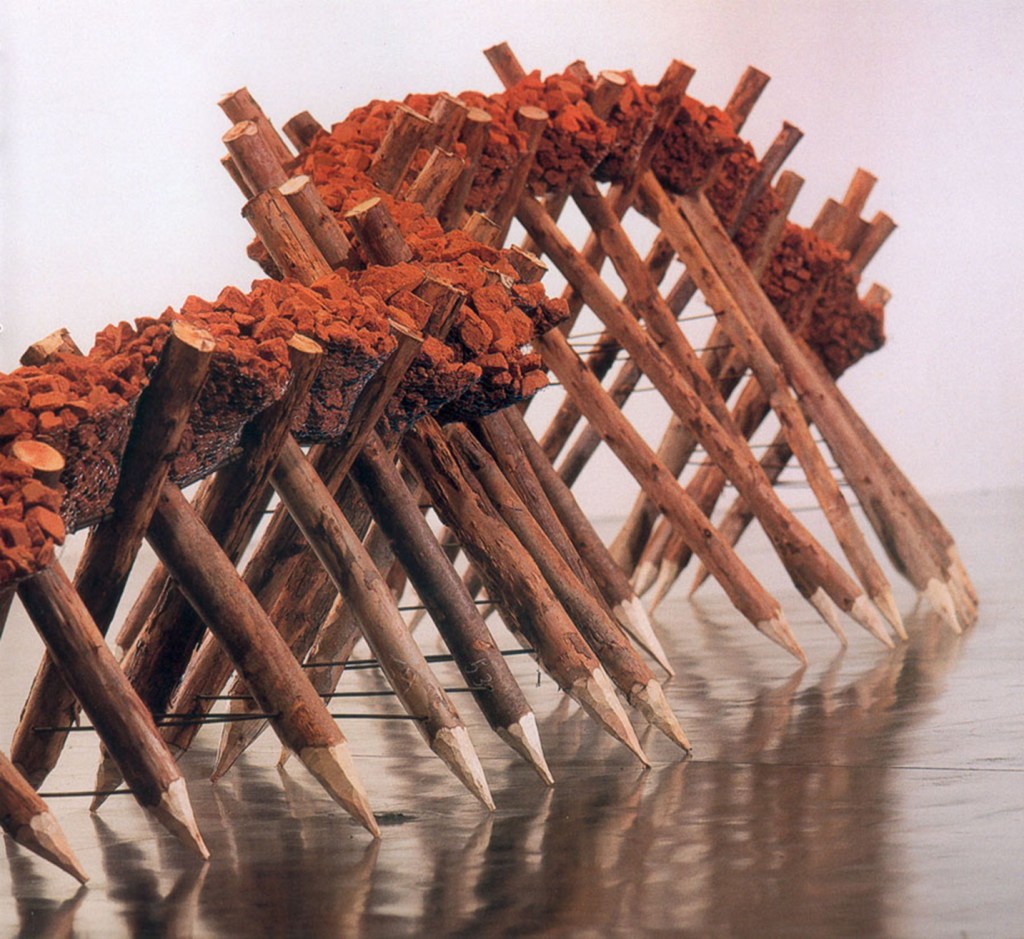 usando cadernos pautados ou quadriculados nos quais fez interferências. Na década seguinte, sua obra é marcada por um envolvimento maior com a escultura. Em grande parte de seu trabalho escultórico, usa materiais da construção civil, trabalhando com formas e superfícies irregulares.