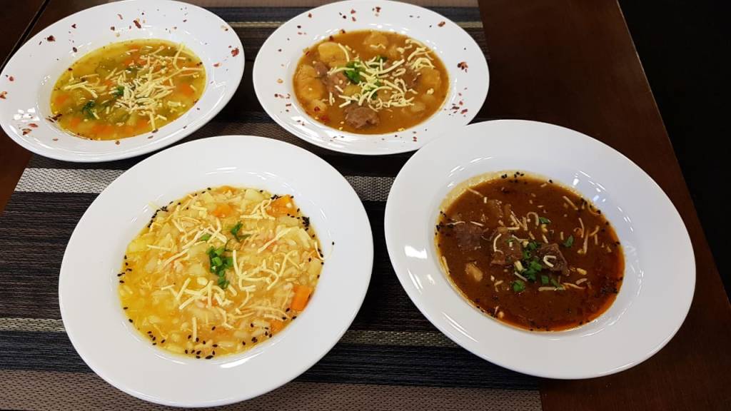 Destaque para os sabores como aipim com bacon, slava, canja, caldo verde, caldo de feijão, vichyssoise, legumes, creme de palmito e creme de milho com frango.
