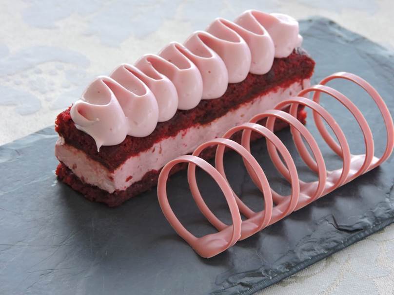 A cobertura de cream cheese da receita recebe calda de framboesa e o tubo passa a ser feito de chocolate Ruby.