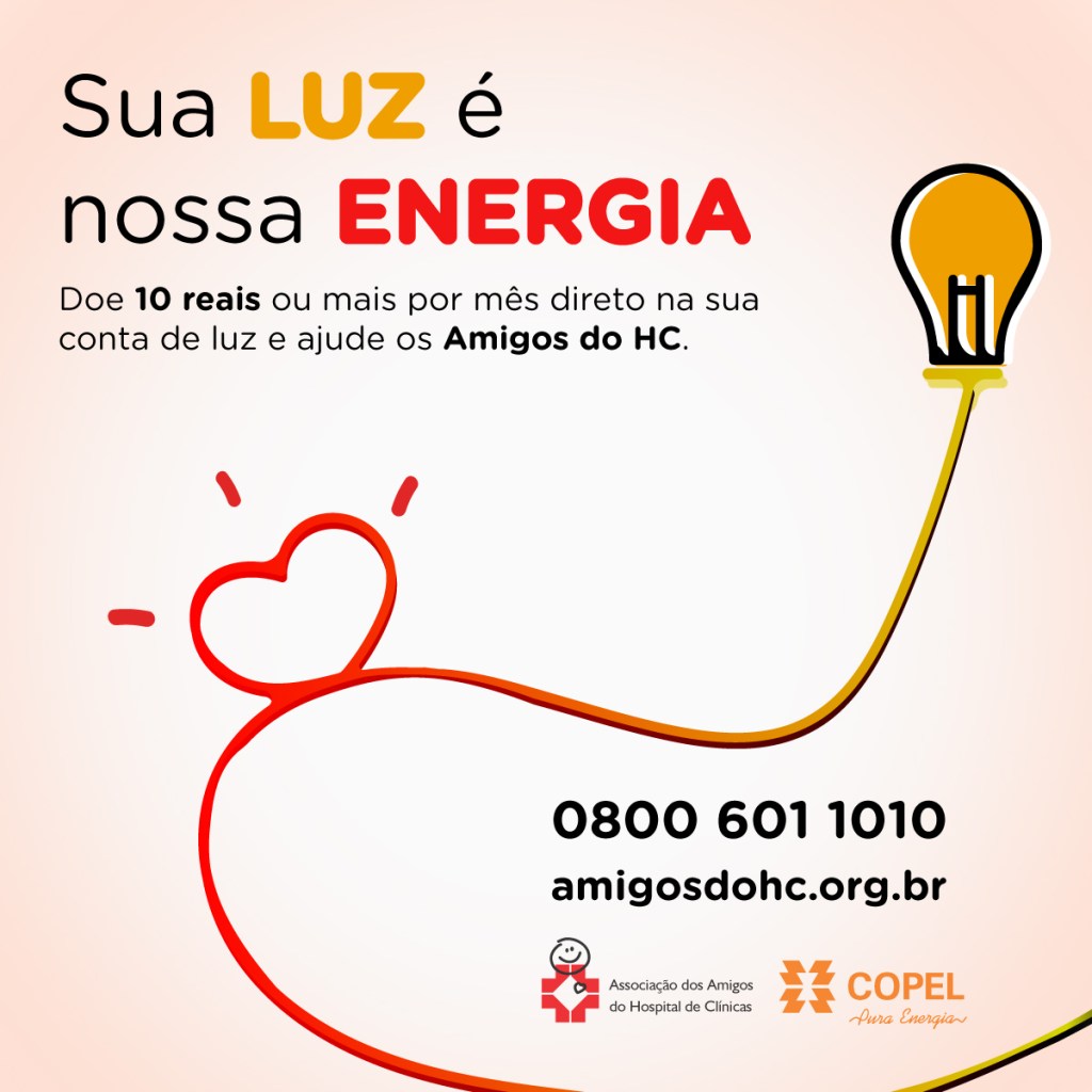 As doações são repassadas pela Copel integralmente aos Amigos do HC. Para doar, basta informar o nome completo, o número da unidade consumidora e o valor desejado para doação mensal. Saiba mais pelo site amigosdohc.org.br ou ligue 0800 601 1010.