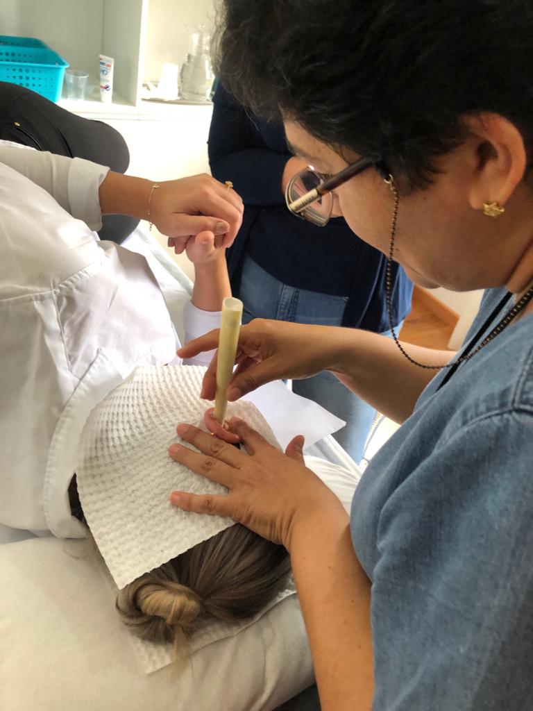 A instrutora explica que a técnica é usada para fazer a desobstrução do ouvido, o que contribui para a melhoria física e sensorial do paciente. Durante o curso, os alunos irão conhecer quais os materiais necessários para aplicar o Cone Hindu e o protocolo durante o procedimento.