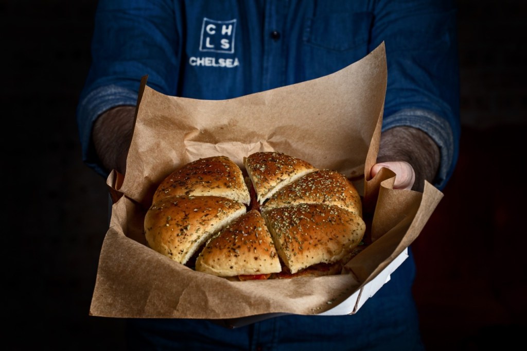 É um sanduíche gigante servido em pão pizza exclusivo do Chelsea. São seis pedaços que servem de duas a três pessoas.