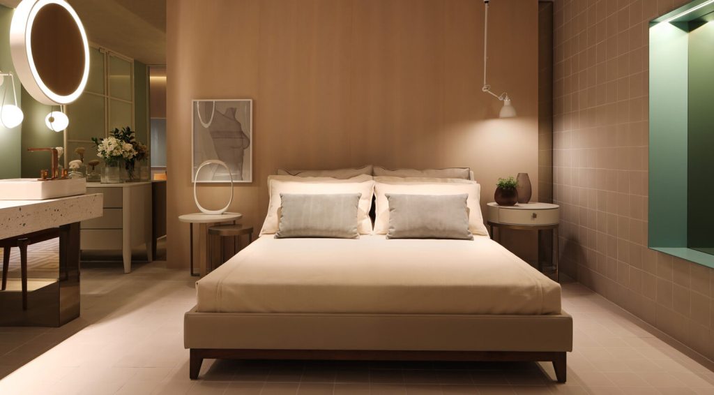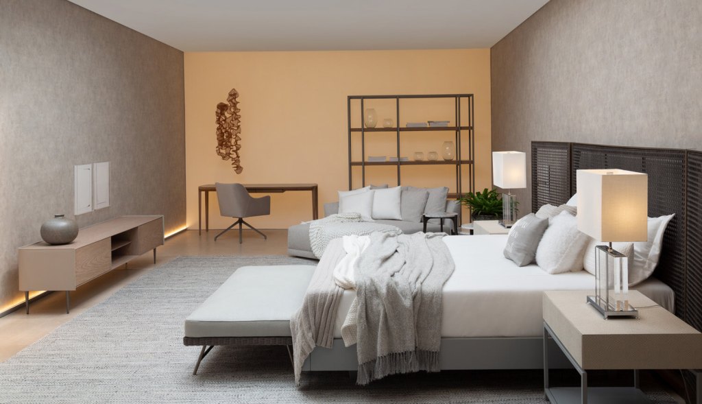 Destaques no mobiliário: cabeceira Piet, com fibra natural em sua composição e mesas de cabeceira Dean, leves e funcionais.