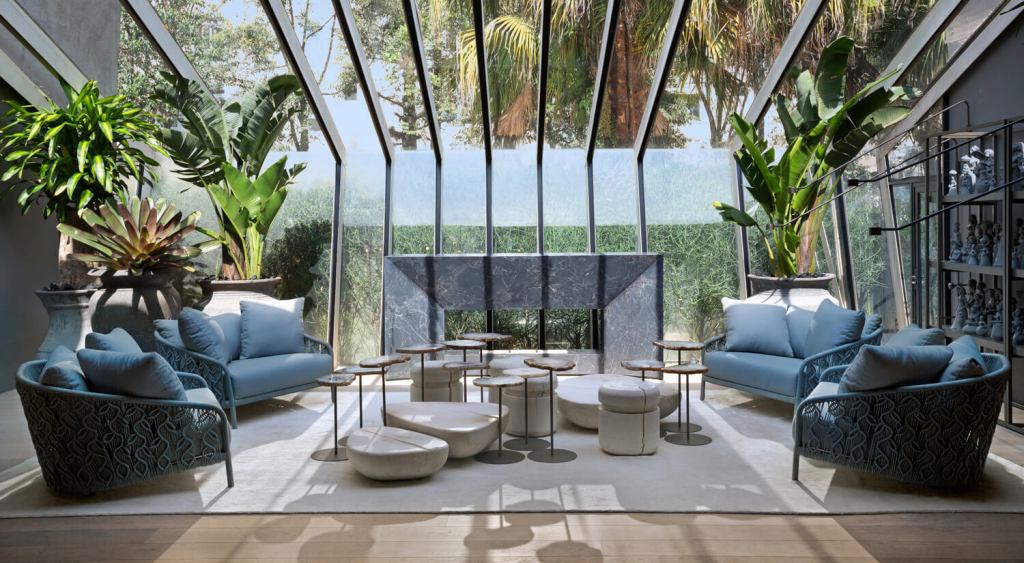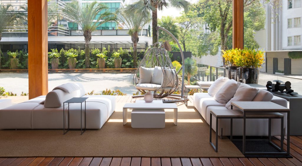 O arquiteto Ivan Wodzinsky apresenta um projeto de arquitetura e paisagismo principal da loja, criando uma grande varanda aberta. Um espaço luxuoso, sóbrio e atemporal, que se conecta a cidade e o seu charmoso urbanismo. A varanda coberta, mas não fechada, é repleta de texturas, com a predominância da madeira, brilhos e reflexos das peças e o verde que circunda toda a área. São quase 100m2, em um espaço que forma ligação visual com o público passante em frente à loja, levando a marca para mais perto das pessoas. Do lado oposto ao terraço, Ivan criou um jardim para a loja, composto de diferentes espécies de vegetações. No mobiliário, peças da linha Beach & Country criam uma atmosfera de contemplação, conforto e beleza com módulos estofados Kondey – onde é possível sentar de qualquer lado – e as confortáveis poltronas Kalasi, completam o grande lounge.