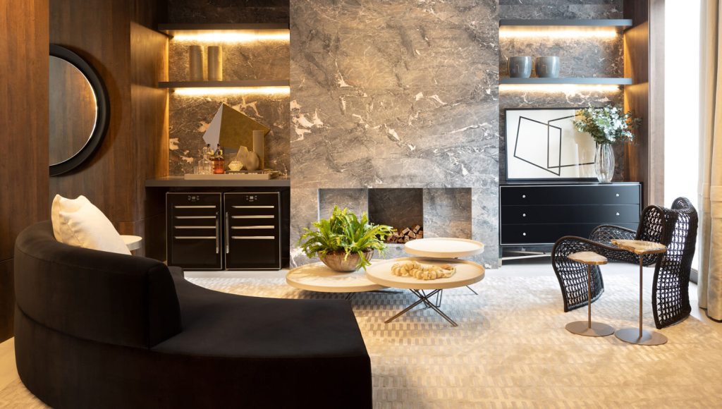 Destaques no mobiliário: mesa de centro Modi, inspirada no pintor Modigliani, com suas linhas sinuosas, textura de mármore nero em uma lapidação orgânica dão fluidez ao layout. Temos que enfatizar também a poltrona Lena, que da leveza e design ao ambiente.