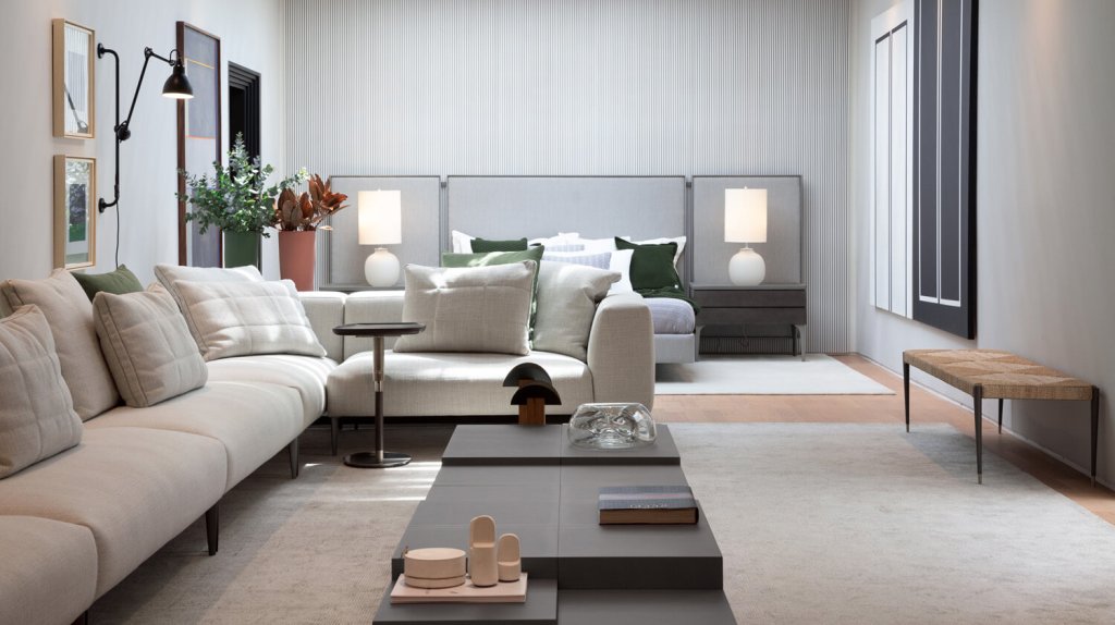 Destaques no mobiliário: as poltronas Times, versão baixa, mais largas e harmonizando com a grande composição dos módulos Maddox.