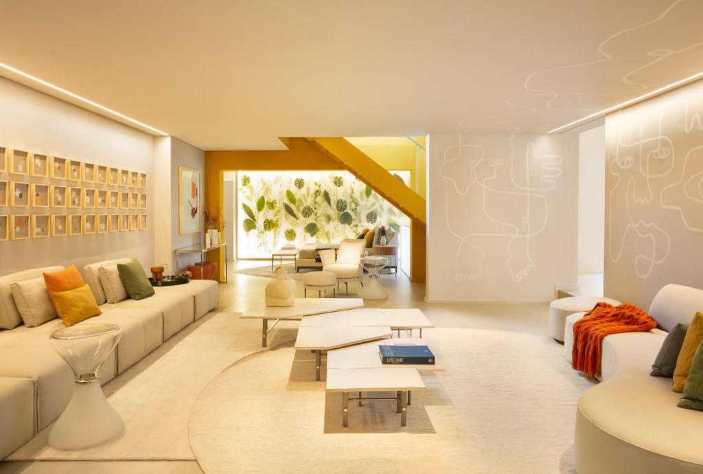Destaques no mobiliário: módulos Maddox usados soltos e dando fluidez ao espaço; e a composição de mesas de centro Pandia em louro em conjunto com as leves Carlo Mix encaixadas e sobrepostas criam movimento para a proposta.
