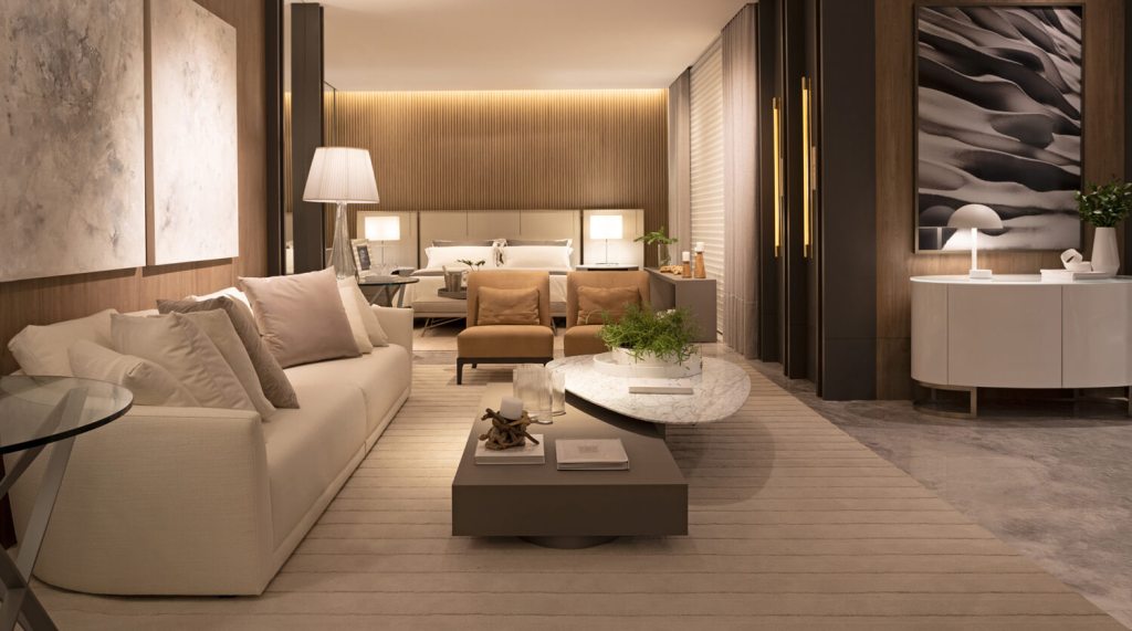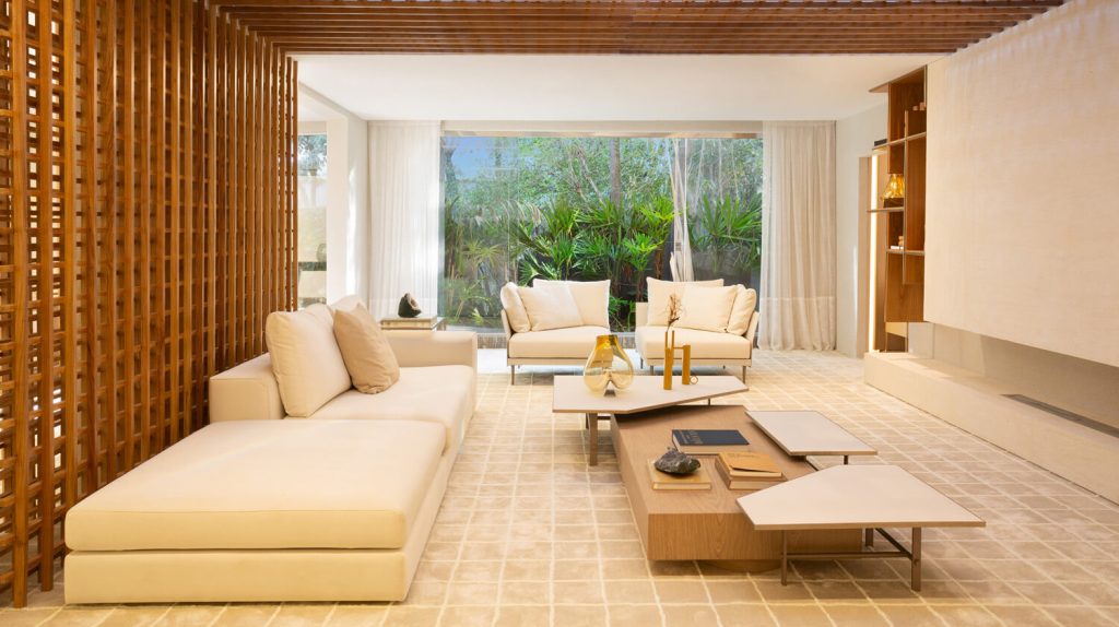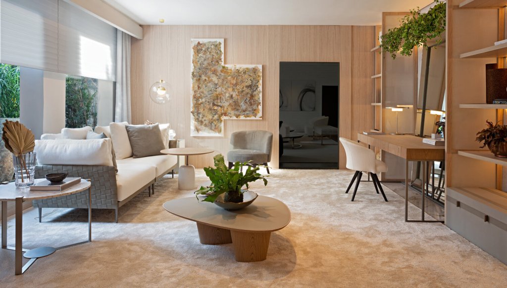 Destaques no mobiliário: Sofá Raja em couro natural Houston, a poltrona Lakor em seda Hassan off white e a poltrona Maros em veludo Hamburgo Sand.