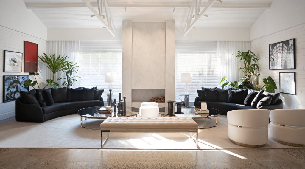 Destaques no mobiliário: Adoramos a composição do todos os móveis do nosso espaço, mas os preferidos são: sofá Harrison com braços em couro, cria um jogo de textura monocromática.