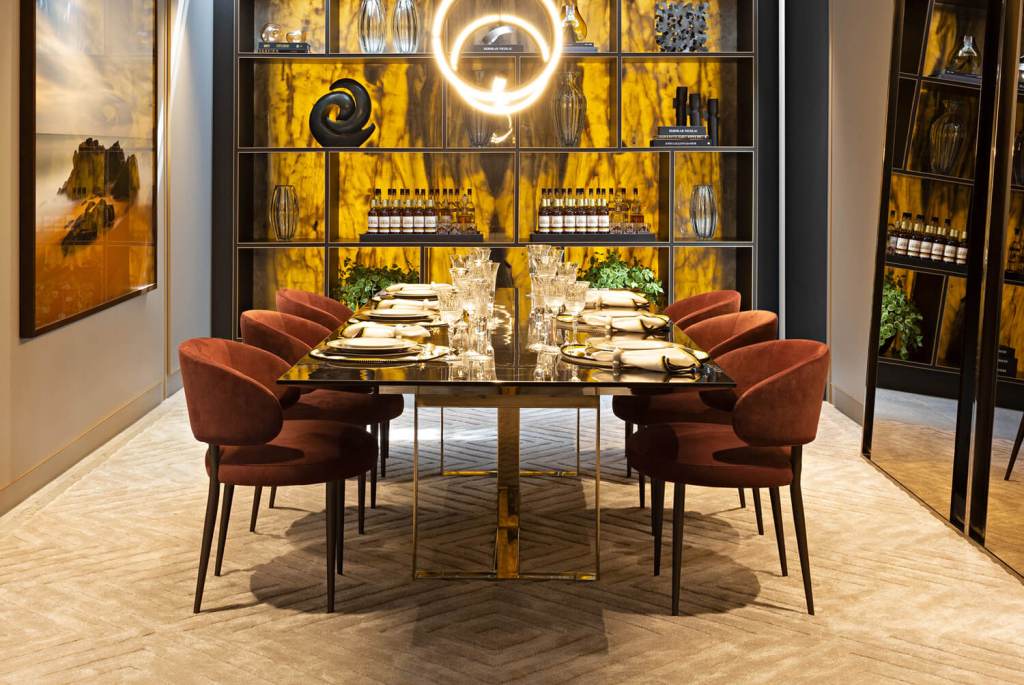Destaques no mobiliário: Mesa de jantar Asti, com base revestida em couro, tampo em cristal para o efeito visual e a valorização da coluna. Sofá Jaen, que integra e acolhe no lounge, e o carrinho de chá Semai, que dá o toque final.