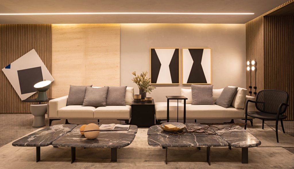 Destaques no mobiliário: sofá Illi, poltronas Desert, que são constantemente usadas pelos profissionais em seus projetos.