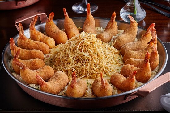 Outra opção famosa da casa é o Camarão Coco Bambu, prato repleto de camarões recheados com catupiry e empanados, servidos sobre cremoso arroz com camarões, ervilhas e presunto, envolvido com molho branco e gratinado com queijos muçarela e parmesão e com acompanhamento de batata palha.