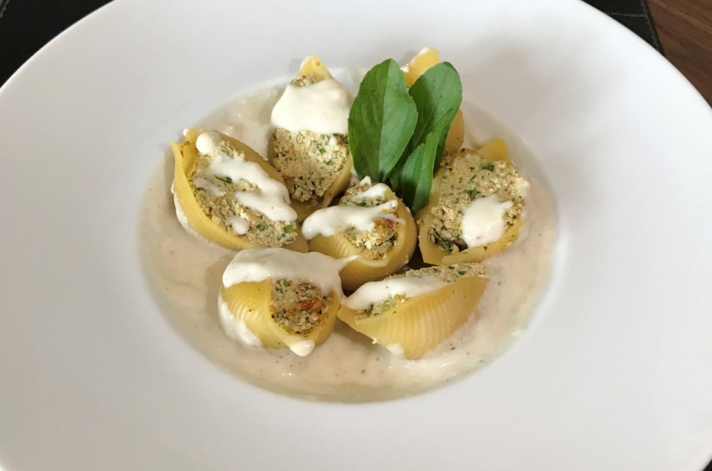 Um é o Conchiglione de ricota com rúcula ao molho bechamel (R$ 40 + 10% de taxas). E o outro, Risoto Caprese, com castanhas, nozes, tomate cereja confit, rúcula e parmesão (R$ 42 + 10% de taxas).