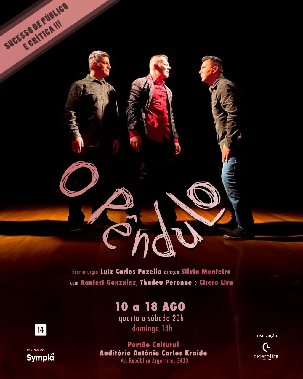 Com direção de Silvia Monteiro e dramaturgia de Luiz Carlos Pazello, “O Pêndulo” prorroga temporada até 18 de de agosto no Portão Cultural- Auditório Antônio Carlos Kraide. As sessões extras se devem a grande procura do público que lotou toda a temporada da peça de quarta a domingo.