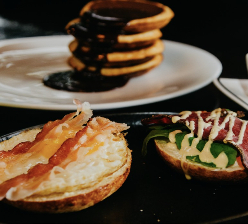 No brunch do The American Way são servidas panquecas americanas com calda a escolher, bagel com ovo e cream cheese, bagel com rúcula, pastrami e mostarda, suco e café coado