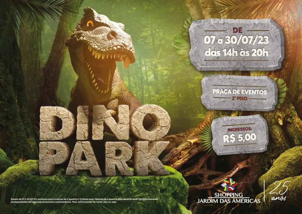 Dino Park / de 7 a 30 de julho, das 14h às 20h / Praça de Eventos – 2º Piso do Shopping Jardim das Américas / Valor: Os ingressos têm o valor simbólico de R$ 5,00, garantindo diversão para toda a família.