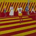 Sobre o primeiro, ganhador do prêmio JAC, a artista explica que vinha explorando a questão da transformação, de tudo que pode vir a ser. “Numa sequência quase cinematográfica, pintei uma moça atravessando a rua e cruzando com algumas freiras; e, no momento do cruzamento, elas trocam de roupa. A moça veste a saia longa do uniforme religioso e as freiras a minissaia, que estavam na moda no período”.