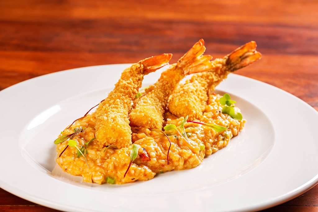 Já nos pratos principais, são três alternativas: Strogonoff de mignon com batatinhas e arroz branco; ou Berinjela à parmegiana na panela de ferro (boa pedida para quem não come carnes); ou Camarões empanados com risoto de moqueca.