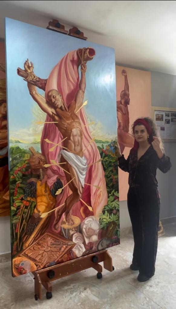 Lara debruçou-se sobre a história do santo por quatro meses, entre a concepção, estudos preliminares e execução do quadro. O conhecimento da artista em anatomia foi essencial para alcançar o resultado que traz imensa força e simbolismo à figura retratada, porém os elementos trazidos para a composição são igualmente simbólicos e intensos e passeiam entre o renascimento, o barroco e o contemporâneo.