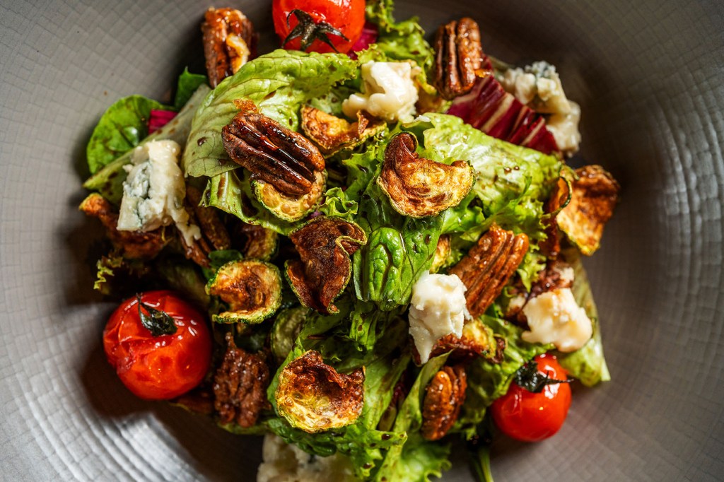 – Salada de folhas com abobrinha dourada, nozes pecan caramelizadas, gorgonzola dolce, tomatinhos defumados ao molho aceto balsâmico (vegetariano)