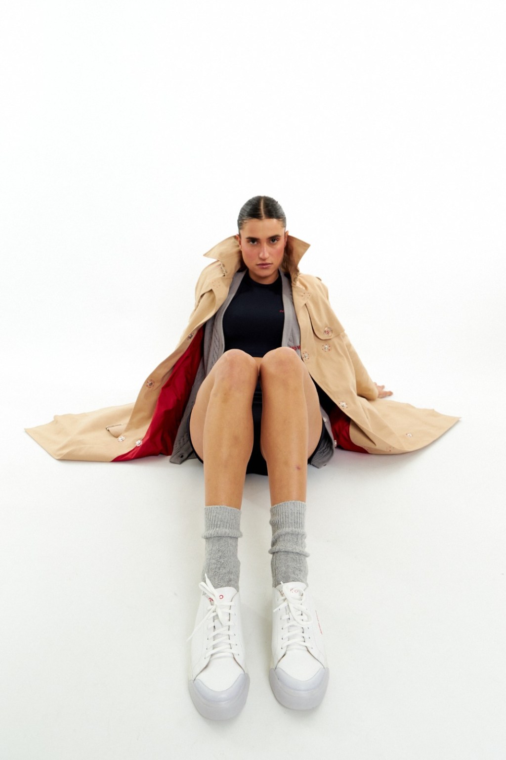 Além de tecidos tecnológicos, como o Emana e o Fluity da tecelagem Santa Constância, a marca usa tricô em viscose e poliamida. A sarja é usada no trench coat e a saia é em algodão com alta quantidade de elastano, torna a peça usável dentro e fora das quadras. Elementos familiares às quadras como plissados, listras e letterings encontram tricôs, botões e amarrações no estilo de uma mulher jovial que usa as fronteiras entre esporte, casual e contemporâneo para se divertir com a moda.