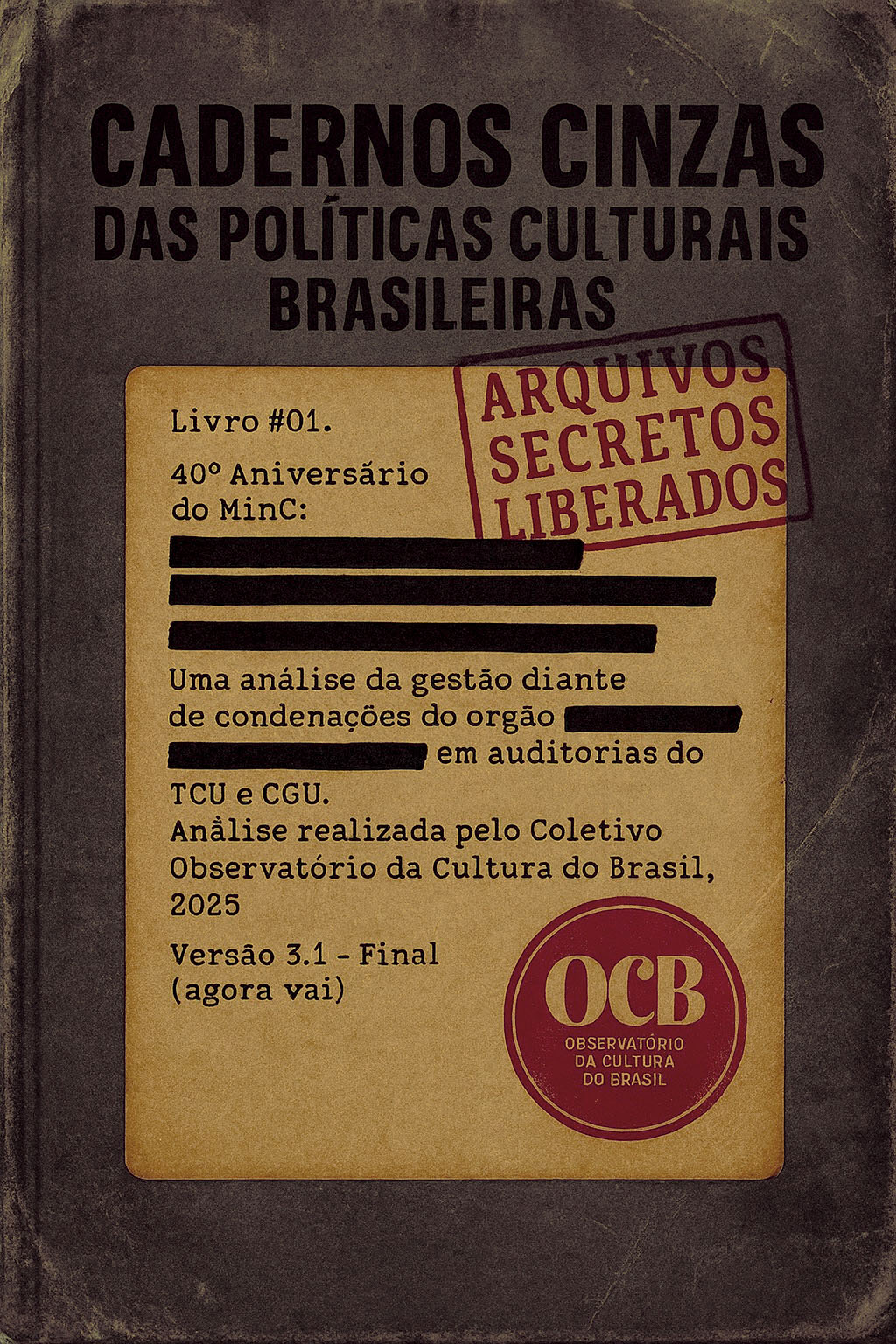 A nova versão (3.1) traz mais de 1.100 páginas de pesquisa crítica e aprofundada sobre os 40 anos de existência do Ministério da Cultura, revelando falhas estruturais e ineficiências que atravessam diferentes governos, em um estudo de interesse público em defesa de movimentos sociais. O novo livro está melhor organizado, com pontos revistos, entre outras melhorias, substituindo a versão 3.0, anterior. Devido a demanda coletiva das informações, a rede de pesquisadores do OCB decidiu tornar o livro público e gratuito, disponível no site www.observatoriodacultura.com.br.