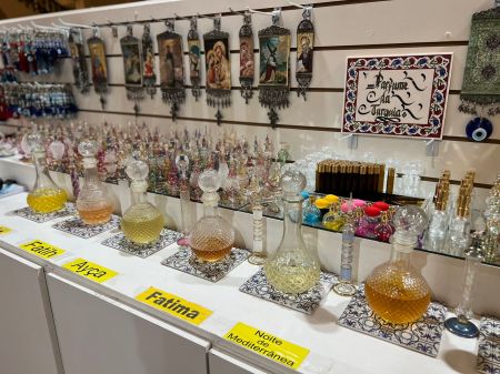 Estão expostos perfumes da Turquia e tapetes da India